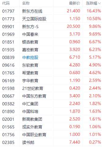 在教育股中,新東方在線(01797.HK)、天立國(guó)際控股(01773.HK)、新東方-S(09901.HK)分別上漲16.43%、10.58%、9.86%。