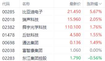 在蘋(píng)果概念中,比亞迪電子(00285.HK)、舜宇光學(xué)科技(02382.HK)、瑞聲科技(02018.HK)分別上漲5.67%、1.76%、2.05%。