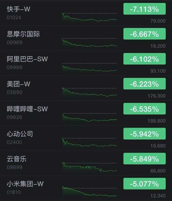 新浪科技訊 7月29日下午消息,香港恒生指數(shù)收跌2.26%,7月累跌近8%;恒生科技指數(shù)跌4.86%,7月累跌超11%。恒生指數(shù)、恒生科技指數(shù)均創(chuàng)2021年7月以來最大月跌幅。快手收跌超7%,嗶哩嗶哩、美團(tuán)、阿里巴巴跌超6%,心動(dòng)公司跌近6%,云音樂和小米跌超5%。