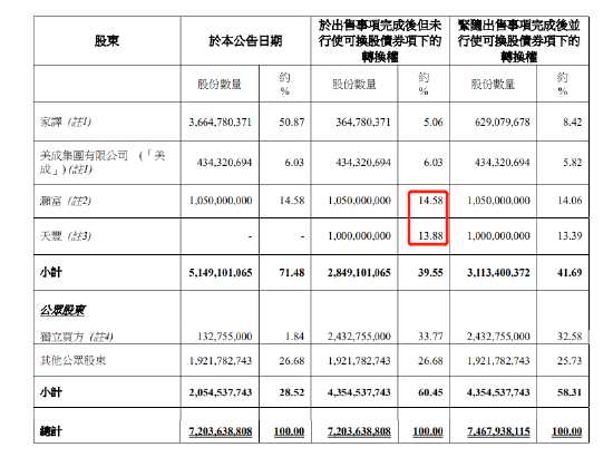 公告稱,天豐的擁有人包括:隋廣義為公司的聯(lián)席主席及非執(zhí)行董事,持有90%股權(quán);李俊杰為公司的行政總裁及執(zhí)行董事,持有5%股權(quán)。隋廣義亦是中國投資基金有限公司的主要股東。香港灝富投資有限公司是10.5億股股份的法定及實(shí)益擁有人,占公司于本公告日期已發(fā)行股本約14.58%。緊隨出售事項(xiàng)完成后,隋廣義將直接或間接通過他于灝富及天豐的利益,視其擁有20.5億股股份,約占公司已發(fā)行股本約28.46%。