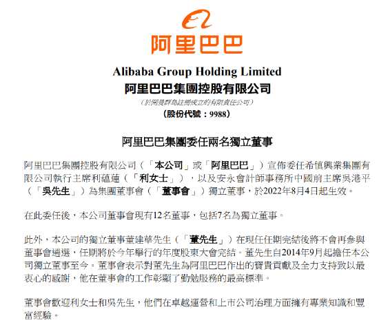 阿里巴巴宣布委任希慎興業(yè)集團(tuán)有限公司執(zhí)行主席利蘊(yùn)蓮,以及安永會(huì)計(jì)師事務(wù)所中國(guó)前主席吳港平為集團(tuán)董事會(huì)獨(dú)立董事,于2022年8月4日起生效。