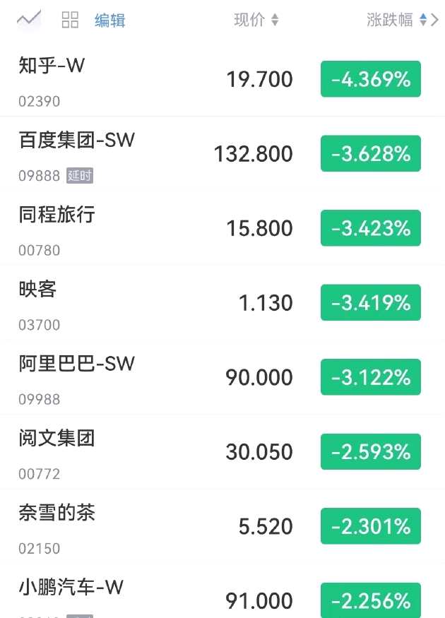 知乎開跌超4%,百度、同程旅行、映客、阿里巴巴跌超3%