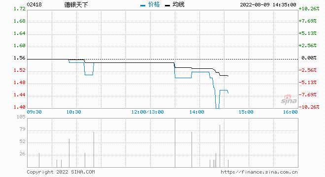 摘要: 8月9日消息,德銀天下午后走低,一度跌超10%,現(xiàn)跌6.41%,報(bào)1.46港元,最新市值31.71億港元。德銀天下(02418.HK)發(fā)布公告,2022年8月6日,