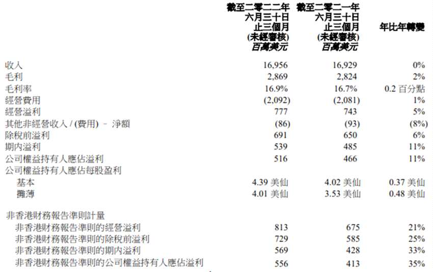 根據(jù)以上數(shù)據(jù)來看,在 2022年4-6月期間,聯(lián)想集團收入為為169.56億美元,同比基本持平;毛利為28.69億美元,同比增長2%;歸母凈利潤為5.16億美元,同比增長11%,非香港財務(wù)報告準則下,歸母持有人應(yīng)占凈利同比增長35%至5.56億美元。