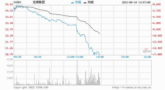 龍湖集團(tuán)午后跌幅不斷擴(kuò)大,目前暴跌14%,單日蒸發(fā)200億市值,最新市值1295億港元。