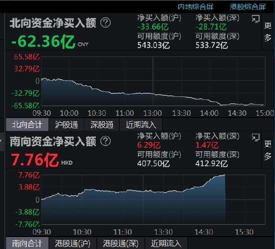 8月10日消息,截至滬深股市收盤,北向資金全天單邊凈賣出62.36億元,連續(xù)3日凈賣出;其中滬股通凈賣出33.66億元,深股通凈賣出28.71億元。
