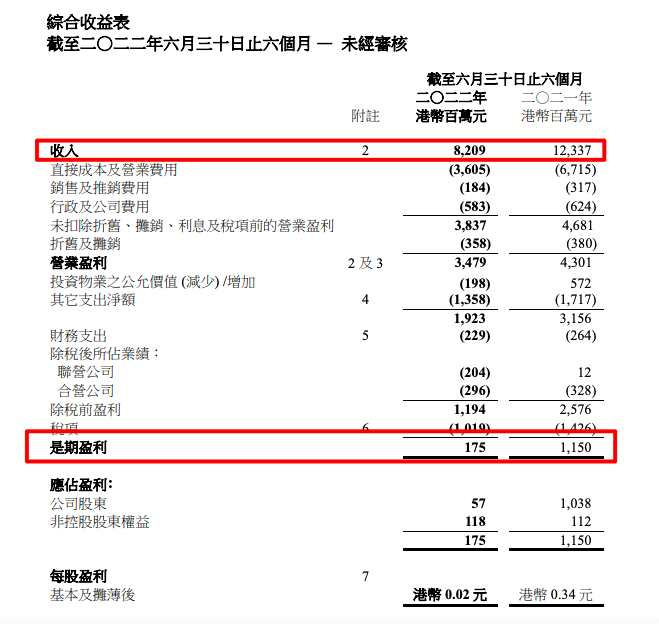 8月11日訊:九龍倉集團(tuán)(0004.HK)截至2022年6月30日止半年度中期業(yè)績顯示,截至2022年6月30日,九龍倉集團(tuán)收入82.09億港元,較上年同期減少33.5%;錄得基礎(chǔ)凈盈利港幣4.28億元(2021年:虧損港幣3.6億元)。若計入投資物業(yè)重估虧損及其它未變現(xiàn)會計收益/虧損,股東應(yīng)占集團(tuán)盈利為港幣5700萬元(2021年:港幣10.38億元),較去年同期下降95%,主要是投資物業(yè)重估未變現(xiàn)虧損及缺乏去年同期錄得的出售非核心投資物業(yè)所得盈利所致。