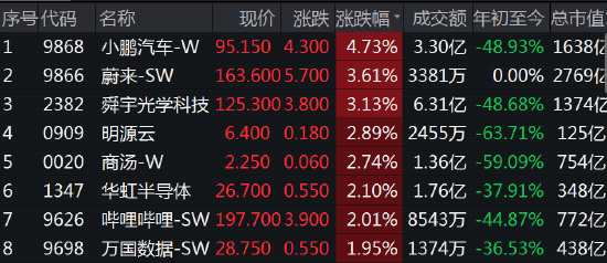 恒生科技指數(shù)漲0.53%,小鵬汽車漲4.73%,蔚來漲3.61%,舜宇光學(xué)科技漲超3%,商湯、華虹半導(dǎo)體、嗶哩嗶哩漲超2%。