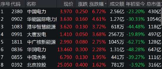 電力需求旺季,電力股走高,中國電力漲6.7%,華能國際(600011)電力漲4.6%,大唐發(fā)電漲3.68%,中廣核新能源、華潤電力等漲超2%。