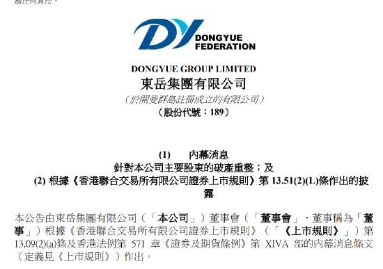 東岳集團(tuán)發(fā)布公告,公司獲其主要股東【新華聯(lián)(000620)、股吧】控股(000036)有限公司(「新華聯(lián)(000620)控股」)告知,北京市第一 中級人民法院已受理湖南富興集團(tuán)有限公司(「湖南富興」)對新華聯(lián)控股提出 的破產(chǎn)重整申請(「重整」),涉及總額人民幣 30,000,000 元加應(yīng)計(jì)利息,因新華聯(lián)控股無法償還其到期債務(wù),但新華聯(lián)控股具有重整可能和潛在重整價(jià)值。