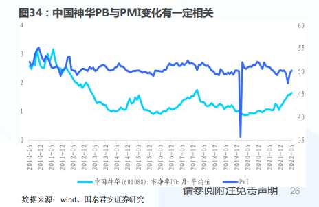 以中國神華為例,作為國內(nèi)最大的煤企和電企(集團層面),中國神華的盈利在很大程度上反應(yīng)宏觀經(jīng)濟運行情況,根據(jù)復(fù)盤梳理,除2015年上半年和2018年2月市場大幅波動行情之外,中國神華pb和國內(nèi)經(jīng)濟走勢相關(guān)性較高。
