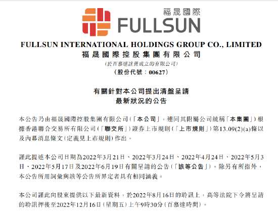 福晟國際發(fā)布公告,高等法院下令將清盤呈請的聆訊押后至2022年12月16日(星期五)上午9時30分(百慕達時間)。