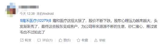 雍禾醫(yī)療股價大跌8%,市值只剩34億港元,今年股價暴跌近60%,有股民表示,“雍和醫(yī)療這招太狠了,股價不斷下跌,股東心理壓力越來越大,頭發(fā)漸漸禿了,最終這些股東變成客戶,為公司帶來源源不斷的生意,砂仁豬心,雁過拔毛也不過如此了”
