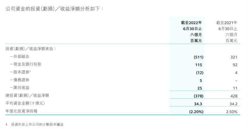 資金的投資虧損凈額為3.78億元(上年同期收益4.28億元),原因是外部管理投資基金(外部組合)錄得公平值虧損凈額5.11億元(上年同期收益3.21億元),反映全球股票及固定收益市場的更廣泛表現(xiàn)。