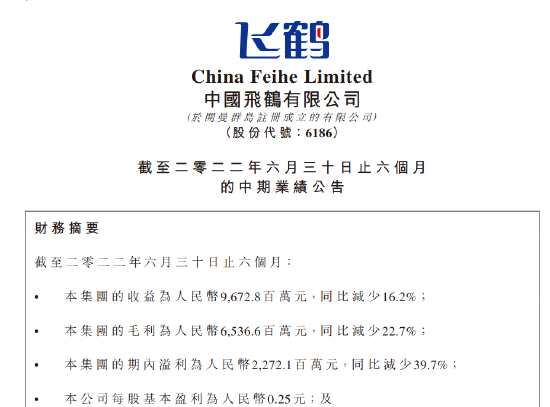 中國飛鶴公布中期業(yè)績,集團的收益為人民幣96.73億元,同比減少16.2%;集團實現(xiàn)毛利為人民幣65.37億元,同比減少22.7%; 集團實現(xiàn)期內(nèi)溢利為人民幣22.72億元,同比減少39.7%;