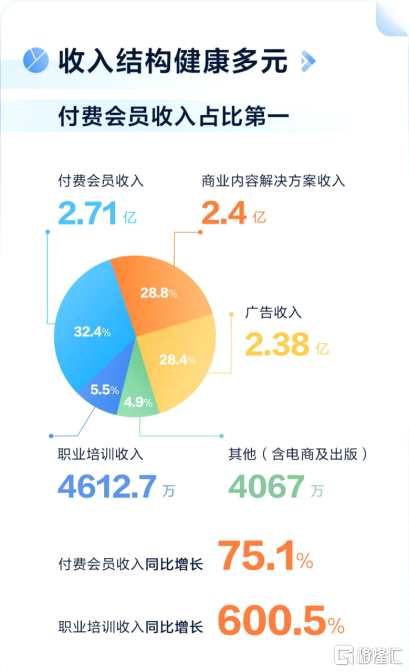 商業(yè)化層面,知乎第二季度營(yíng)收達(dá)到8.36億元,同比增長(zhǎng)31%,毛利率達(dá)47.8%,繼續(xù)保持在行業(yè)高端。知乎的收入結(jié)構(gòu)也更加健康多元,表現(xiàn)為付費(fèi)會(huì)員、職業(yè)教育為代表的C端收入持續(xù)高速增長(zhǎng)。付費(fèi)會(huì)員收入創(chuàng)下2.71億元新高,同比增長(zhǎng)75.1%,在總收入中的占比首次升至第一位。職業(yè)教育收入依然保持超高增速,收入達(dá)到4612.7萬(wàn)元,同比增長(zhǎng)600.5%,正在成為新的增長(zhǎng)動(dòng)力。電商、出版等其他收入達(dá)到4067萬(wàn)元,同比增長(zhǎng)91.9%。