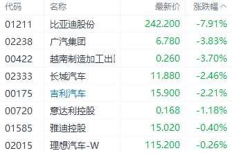 以上消息也令今日汽車股走勢承壓,其中比亞迪股份(01211.HK)跌7.91%、廣汽集團(tuán)(601238)(02238.HK)跌3.83%、長城汽車(02333.HK)跌2.46%。