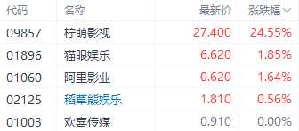 在電影概念股中,檸檬影視(09857.HK)、阿里影業(yè)(01060.HK)、貓眼娛樂(01896.HK)分別上漲24.55%、1.64%、1.85%。