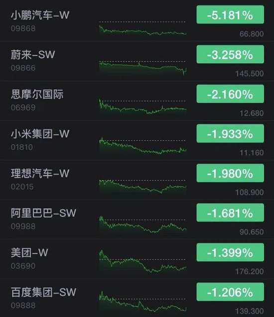 新浪科技訊 9月2日下午消息,香港恒生指數(shù)收跌0.74%,恒生科技指數(shù)跌1.44%,小鵬汽車收跌超5%,蔚來跌超3%,小米、理想汽車跌近2%,阿里巴巴、美團(tuán)、百度跌超1%;新東方在線漲超12%。