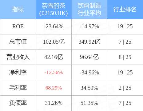 奈雪的茶市值102.05億元,在飲料制造行業(yè)中排名第7。主要指標(biāo)見(jiàn)下表: