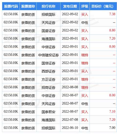 截至2022年9月2日收盤(pán),奈雪的茶(02150.HK)報(bào)收于6.05元,上漲1.68%,換手率0.29%,成交量489.3萬(wàn)股,成交額2969.0萬(wàn)元。投行對(duì)該股的評(píng)級(jí)以買入為主,近90天內(nèi)共有8家投行給出買入評(píng)級(jí),近90天的目標(biāo)均價(jià)為7.58。招銀國(guó)際最新一份研報(bào)給予奈雪的茶買入評(píng)級(jí),目標(biāo)價(jià)7.38。