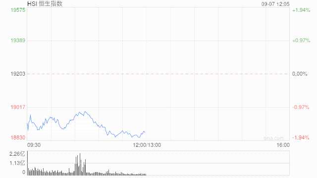 摘要: 9月7日消息,美股周二收跌,納指連續(xù)第7個交易日下滑。今日開盤,港股恒指低開1.49%失守19000點,隨后跌幅擴大。截至午間收盤,恒生指數(shù)跌1.68%,報18880.22點,國企指數(shù)跌1.44%,