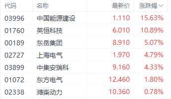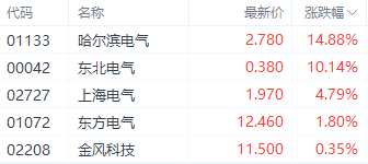 在電力設(shè)備股中,哈爾濱電氣(01133.HK)、上海電氣(02727.HK)、東北電力(00042.HK) 分別上漲14.88%、4.79%、10.14%。