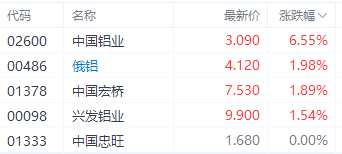 在鋁金屬股中,中國鋁業(yè)(02600.HK)、中國宏橋(01378.HK)、俄鋁(00486.HK)分別上漲6.55%、1.89%、1.98%。