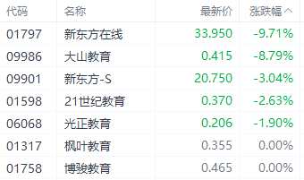 而教育股中,新東方在線(01797.HK)、大山教育(09986.HK)、新東方-S(09901.HK)分別下跌9.71%、8.79%、3.04%。