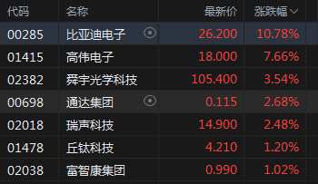 蘋果概念股集體上漲 比亞迪電子漲近11%高偉電子漲近8%