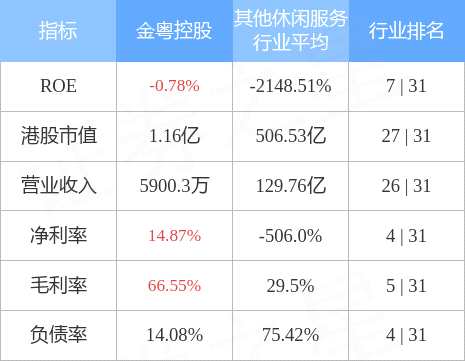 金粵控股港股市值1.16億港元,在其他休閑服務(wù)行業(yè)中排名第27。主要指標見下表: