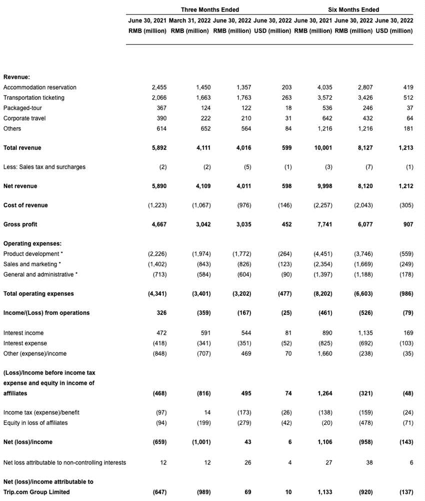 9月22日,攜程集團(tuán)披露2022年二季度財報,營業(yè)收入為40億元,同比下降32%,環(huán)比下降2%;經(jīng)調(diào)整EBITDA為3.55億元,相比上季度的9100萬元增長了290%;凈利潤為6900萬元,上年同期為凈虧損6.47億元,上一季度為凈虧損9.89億元。