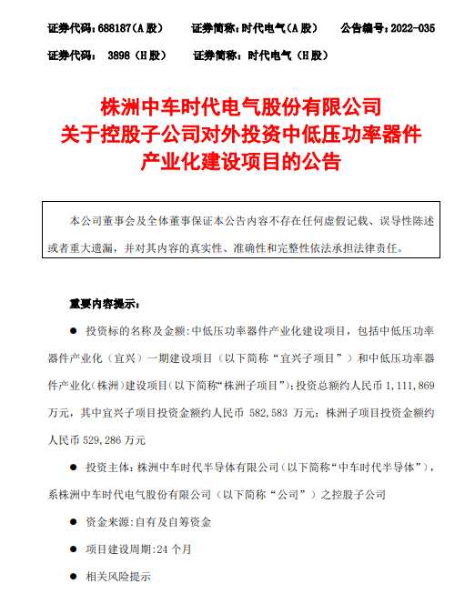 根據(jù)公告,時(shí)代電氣控股子公司株洲中車時(shí)代半導(dǎo)體有限公司擬分兩地投建中低壓功率器件產(chǎn)業(yè)化建設(shè)項(xiàng)目,項(xiàng)目投資總額約111.19億元,其中宜興子項(xiàng)目投資金額約58.26萬元人民幣;株洲子項(xiàng)目投資金額約52.93萬元人民幣。