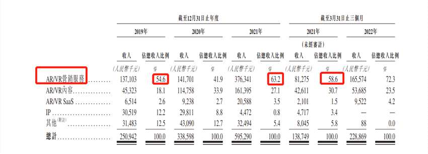 AR/VR營(yíng)銷(xiāo)服務(wù)是飛天云動(dòng)目前的主要收入來(lái)源,另外兩項(xiàng)收入來(lái)源分別為AR/VR內(nèi)容和AR/VR SaaS。其中,2019-2021年及2022年第一季度,飛天云動(dòng)來(lái)自AR/VR營(yíng)銷(xiāo)服務(wù)的收入分別為1.37億元、1.42億元、3.67億元和1.66億元,占比分別為54.6%、41.9%、63.2%,截至2022年3月底占比更是達(dá)到72.3%。