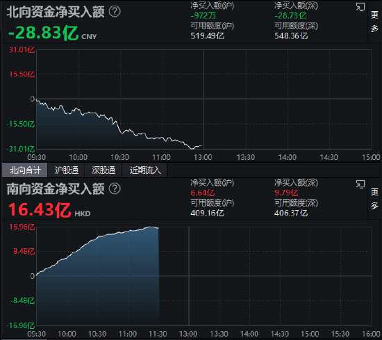 9月23日消息,截至滬深股市午間收盤,北向資金凈賣出28.83億元,滬股通凈賣出972萬元,深股通凈賣出28.73億元。
