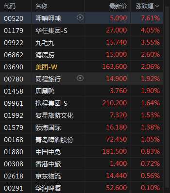 9月26日消息,節(jié)假日概念股集體上漲,呷哺呷哺漲近8%,華住集團(tuán)漲超4%,九毛九漲3.55%,海底撈漲2.6%,美團(tuán)漲2.06%。