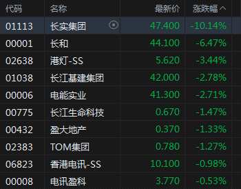 9月26日消息,長(zhǎng)和系股票午后走低,長(zhǎng)實(shí)集團(tuán)跌超10%,長(zhǎng)和跌超6%,港燈跌超3%,電能實(shí)業(yè)跌2.83%。