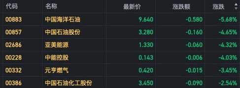 9月26日港股油氣板塊今日持續(xù)走低,午后迎來一波跳水。截至發(fā)稿中國(guó)海洋石油(00883.HK)跌近6%,中國(guó)石油股份(00857.HK)跌近5%,亞美能源(02686.HK)、中能控股(00228.HK)跌超4%,中國(guó)石油化工股份(00386.HK)、元亨燃?xì)?00332.HK)跟跌。