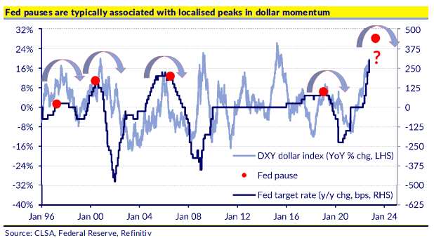 圖:美聯(lián)儲(chǔ)停息通常與美元增長勢(shì)頭的局部峰值有關(guān)