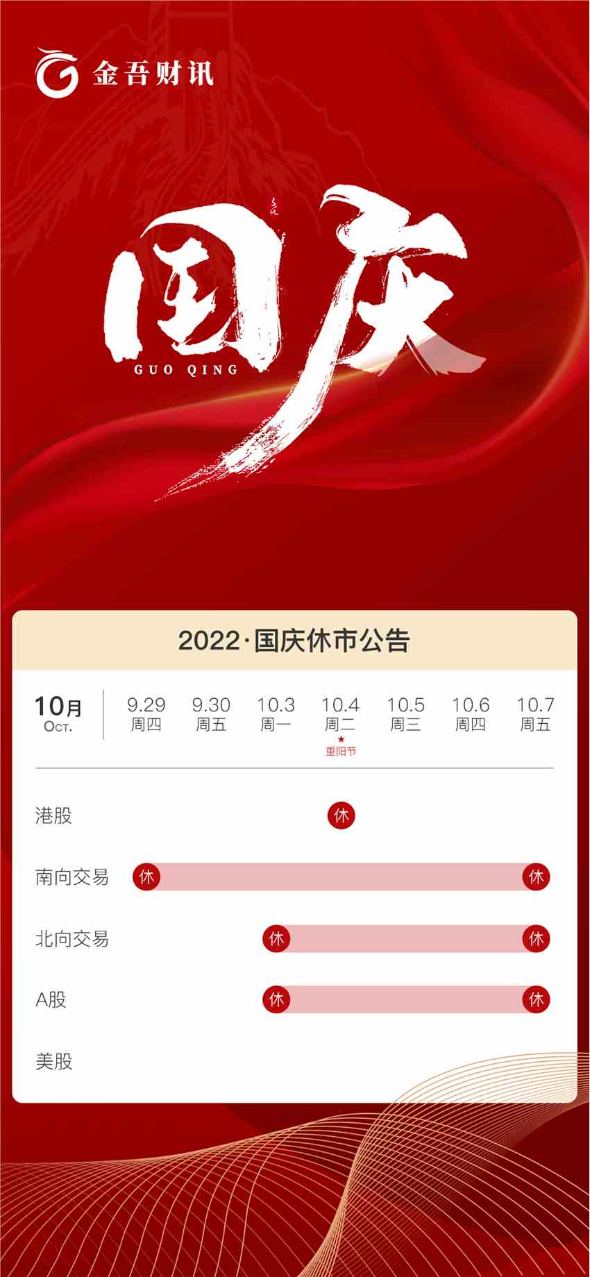 港股:10月1日(星期六(002291),國慶節(jié))-10月2日(星期日)為周末正常休市,10月3日(星期一)如常開市,10月4日(星期二,重陽節(jié))休市一天。