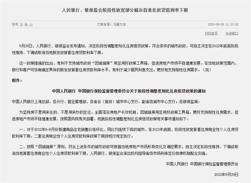 摘要: 9月29日,人民銀行、銀保監(jiān)會發(fā)布通知,決定階段性調(diào)整差別化住房信貸政策。符合條件的城市政府,可自主決定在2022年底前階段性維持、下調(diào)或取消當(dāng)?shù)匦掳l(fā)放首套住房貸款利率下限。