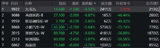 消費股走低,九毛九暴跌近10%,再鼎醫(yī)藥跌近7%,小鵬汽車、理想汽車跌超5%,海底撈跌近4%。