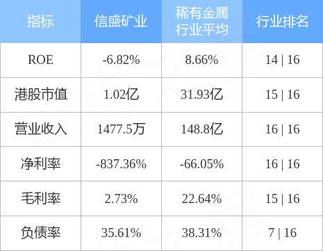 信盛礦業(yè)港股市值1.02億港元,在稀有金屬行業(yè)中排名第15。主要指標見下表: