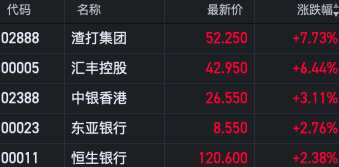 香港銀行股集體走高 渣打集團(tuán)漲近8%匯豐控股漲超6%