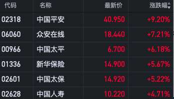 內(nèi)險(xiǎn)股集體上漲 中國(guó)平安漲超9%中國(guó)太平漲超6%