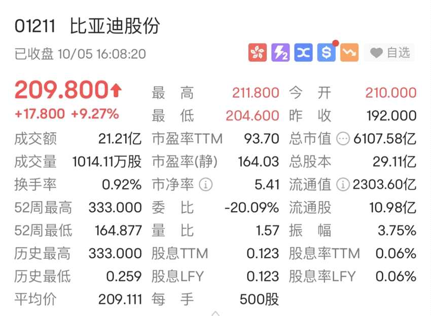 比亞迪股份(1211.HK)是最受關(guān)注的香港上市公司之一,今日漲幅超過9%,股價(jià)一度站上210港元。如此大的漲幅,至少今年下半年以來,還是首次。