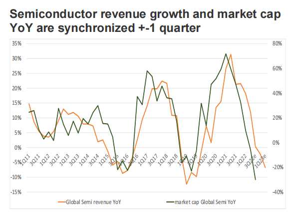 圖:半導(dǎo)體收入增長和市值同比同步提前/延后1個季度
