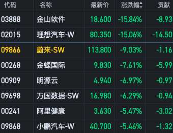 10月7日消息,恒生科技指數(shù)午后跌幅擴大至3%,金山軟件跌近16%,理想汽車跌超15%,蔚來跌超9%,金蝶國際跌近8%。