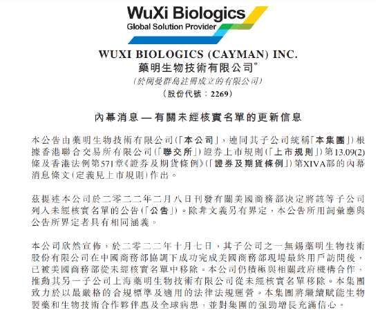 藥明生物:無錫藥明生物已被美國商務(wù)部從未經(jīng)核實名單中移除