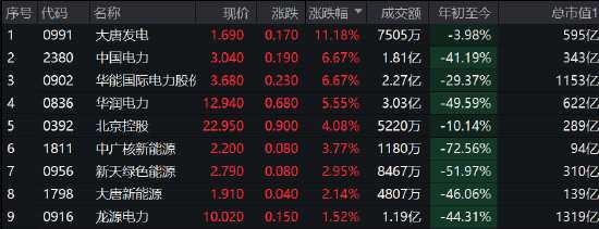香港電力股走勢(shì)強(qiáng)勁,大唐發(fā)電漲超11%,中國(guó)電力漲6.7%,華潤(rùn)電力漲超5%,中廣核新能源漲3%。